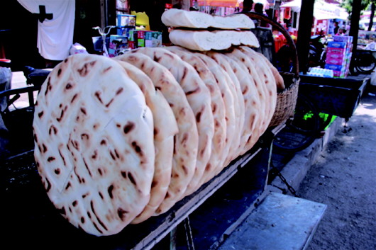 將面粉中加入一定比例的堿水,調(diào)和成面團(tuán)揉入早發(fā)酵好的面團(tuán),然后再添入大量干面,接下來(lái)才是關(guān)鍵所在:用堅(jiān)硬、光滑、沉重的木頭杠子一頭固定(形如杠桿),一頭人工操作,反復(fù)揉壓面團(tuán),直到將干面團(tuán)壓成綢子一樣綿軟,再切成1斤、2斤或3斤的面劑子,搟成圓餅狀,抹上清油,撒上少許鹽和胡椒、苦豆、姜黃等佐料,最后將面餅卷起來(lái),豎立壓制成團(tuán),再用木杠搟壓成厚而大的圓餅,并在上面用干凈的梳齒等工具精心旋出花紋圖案,抹少許清油,便可上鏊烘烤。