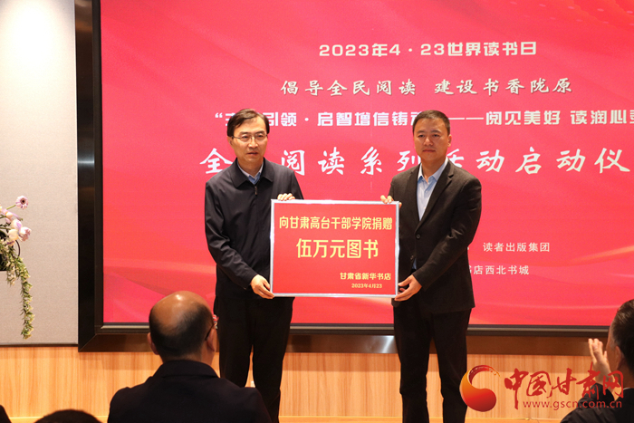 啟動(dòng)儀式上,讀者出版集團(tuán)黨委書記、董事長(zhǎng)梁朝陽向高臺(tái)干部學(xué)院捐贈(zèng)圖書并宣布系列活動(dòng)正式啟動(dòng)。讀者出版集團(tuán)黨委委員、副總經(jīng)理王光輝與甘肅省新華書店黨委書記、董事長(zhǎng)張曉東向讀者代表“甘肅好人”景正紅、“優(yōu)秀護(hù)士”嚴(yán)曉麗、“公安之星”王令成、“優(yōu)秀教師”王云芳捐贈(zèng)圖書。