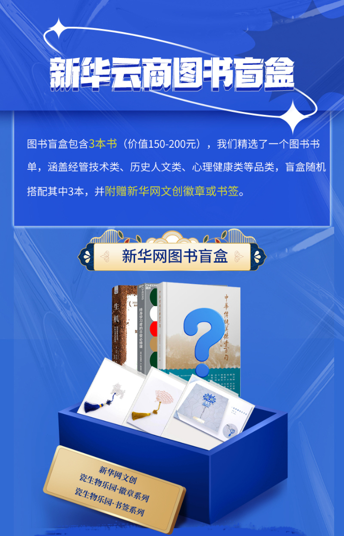 本次活動(dòng)由新華云商聯(lián)合機(jī)械工業(yè)出版社、中國(guó)科學(xué)技術(shù)出版社、光塵文化、湛廬文化共同推出。盲盒內(nèi)圖書涵蓋經(jīng)管技術(shù)類、歷史人文類、心理健康類等品類,將隨機(jī)搭配三本,可能與您的藏書重復(fù),或不符合您的閱讀愛好,請(qǐng)您慎重選擇理性購(gòu)買。同時(shí),盲盒內(nèi)會(huì)附贈(zèng)新華網(wǎng)文創(chuàng)徽章或書簽。