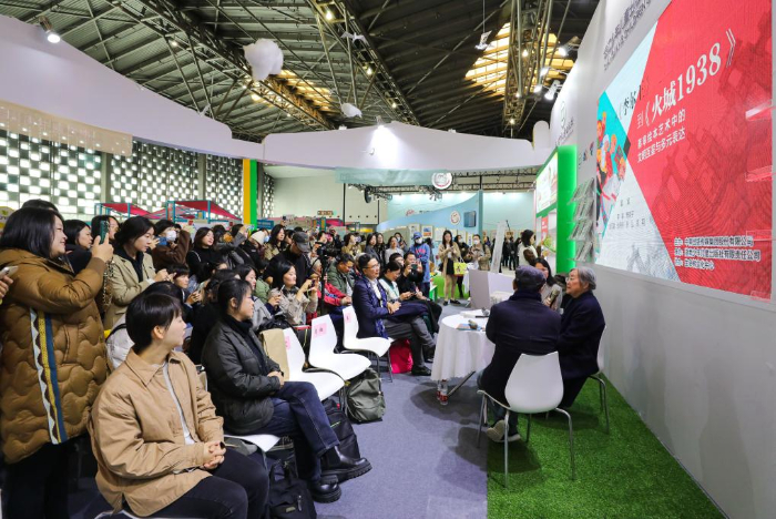 11月17日,藝術(shù)家蔡皋(右一)在第十屆中國上海國際童書展現(xiàn)場與書迷交流。