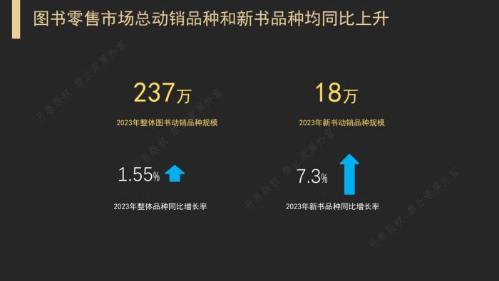 上述《報告》顯示,2023年整體零售市場總動銷品種達(dá)237萬種,同比上升1.55%,動銷新書品種達(dá)18萬種,同比上升7.3%。