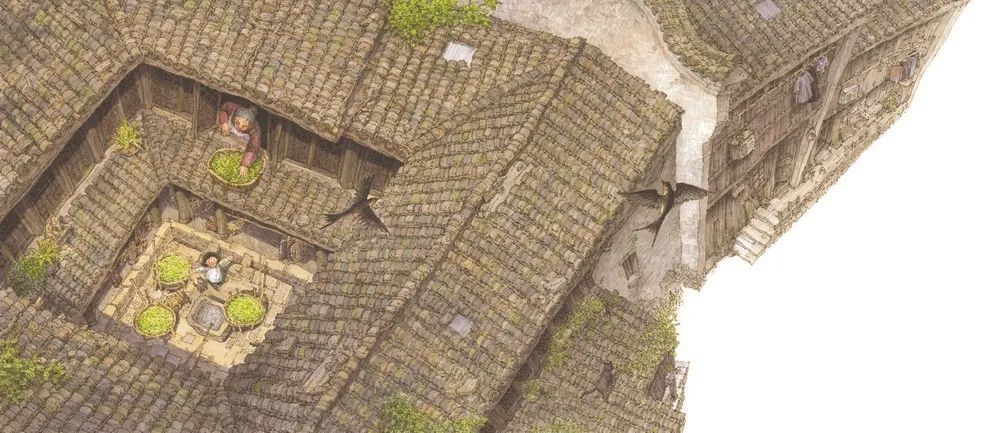 整個繪本主要采用寫實性的現(xiàn)實主義風(fēng)格,繪畫者付出極大的耐心和精力,用鋼筆和馬克筆細致描繪每一片磚瓦、每一塊石板、每一叢花葉、每一扇門窗,甚至每一條木紋、每一絲波紋、每一道皺紋……力求真實地呈現(xiàn)物像的肌理和質(zhì)感,讓人身臨其境。同時,也加以寫意的手法,用柔和的淡彩渲染懷舊的色調(diào)和溫馨的氛圍。尤其值得稱道的是,在多幅畫面中,以丫丫等待的“神秘的客人”——燕子為一種符號角色,無論之于畫面還是主旨,都有其獨到的意義。燕子飛翔于水面和屋宇之上,給靜態(tài)的環(huán)境帶來靈動之感,有時還能平衡畫面的結(jié)構(gòu)。燕子是江南春天的使者,也是童年喜愛的精靈。蘇軾和歐陽修各自的《蝶戀花》詞中都寫到了燕子,前者是:“花褪殘紅青杏小。燕子飛時,綠水人家繞。”后者是:“畫閣歸來春又晚。燕子雙飛,柳軟桃花淺。”這一古典意象在繪本畫面中的反復(fù)出現(xiàn),羽翼間展開了江南的典雅、清麗以及輕愁。作品里的另一種動物是時??M繞主人腳邊的貓咪,增添了祥和的家居趣味,也代表一種熟稔的情感皈依。原本黑瓦白墻的江南民居在畫面中作為背景或前景,灰中帶彩、冷中帶暖,既體現(xiàn)了時間的流逝,也象征著永恒的家園。外公背著丫丫雨夜歸家的場景以多個連貫畫面變換角度來鋪展,暗夜中始終有溫暖的燈光照亮回家的路,也有堅實的后背托舉稚嫩的夢,給孩子以安全、安穩(wěn)和安心。