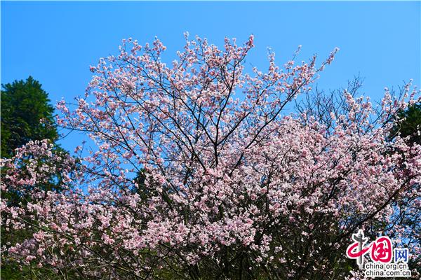 湖南新邵“長壽村”萬畝櫻花怒放 宛若七彩水墨畫