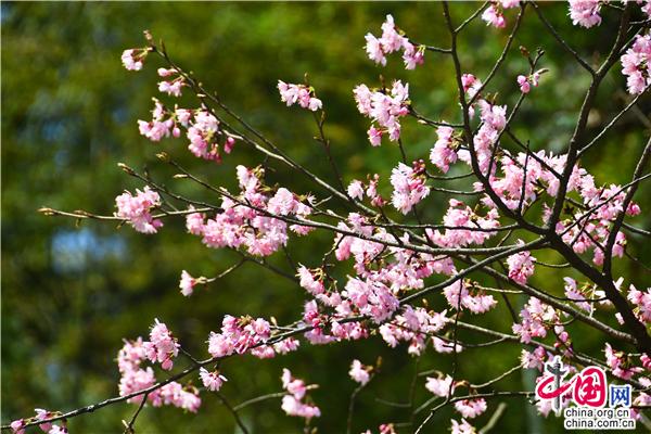 沿著蜿蜒的旅游公路,兩旁海拔600多米的山坡上開滿了櫻花,一簇簇櫻花投印在蒼翠山麓與柳綠間,潔白的、粉色的、玫紅的花朵,迎風(fēng)搖曳,儼然一副七彩水墨畫。