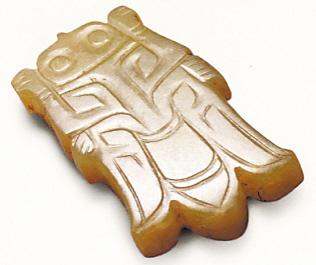 甘肅正寧縣湫頭鄉(xiāng)西侯郎出土的一件漢代豬形玉握,高2.9厘米,長(zhǎng)12.1厘米,寬2.4厘米。呈平臥圓柱形,四肢屈于身下。玉豬雄渾博大,用自然豪放的“漢八刀”技法雕出,刻線為一面坡形??赡苁悄怪魅松跋矏?ài)的握玉,死后隨葬。