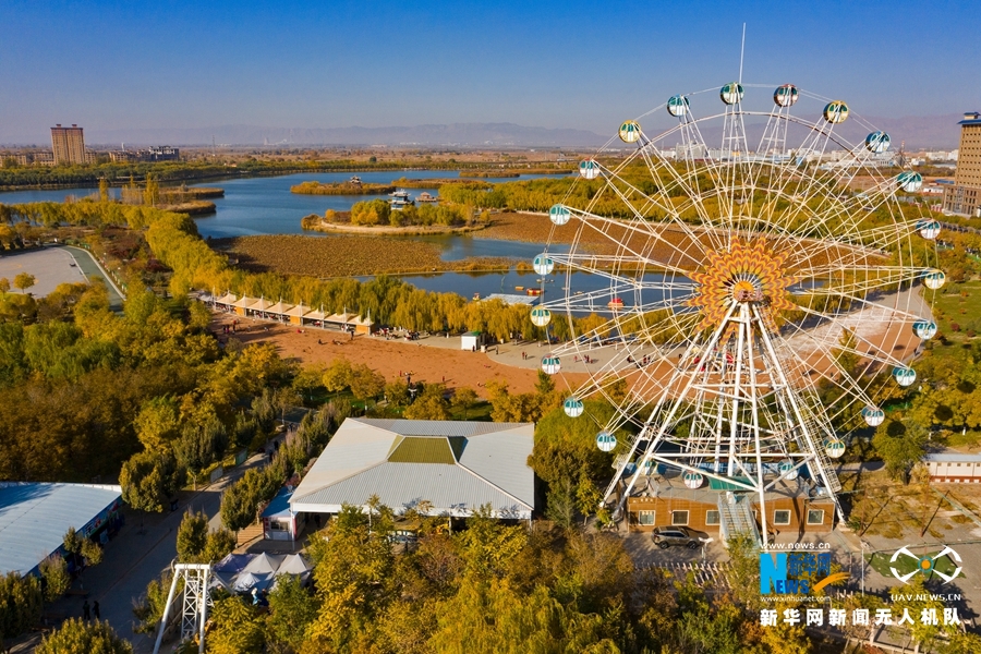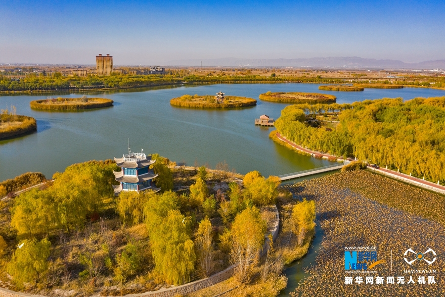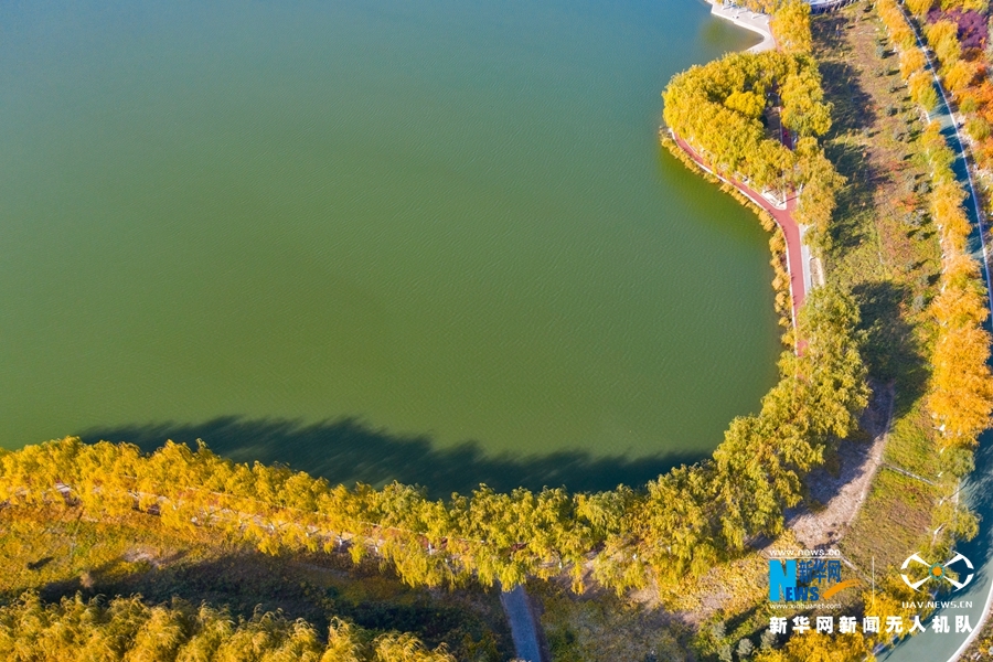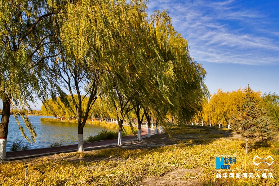 深秋時節(jié),國家4A級景區(qū)甘肅省張掖潤泉湖公園秋水依依,草木金黃,呈現(xiàn)出一幅斑斕畫卷。新華網(wǎng)發(fā)(成林 攝)