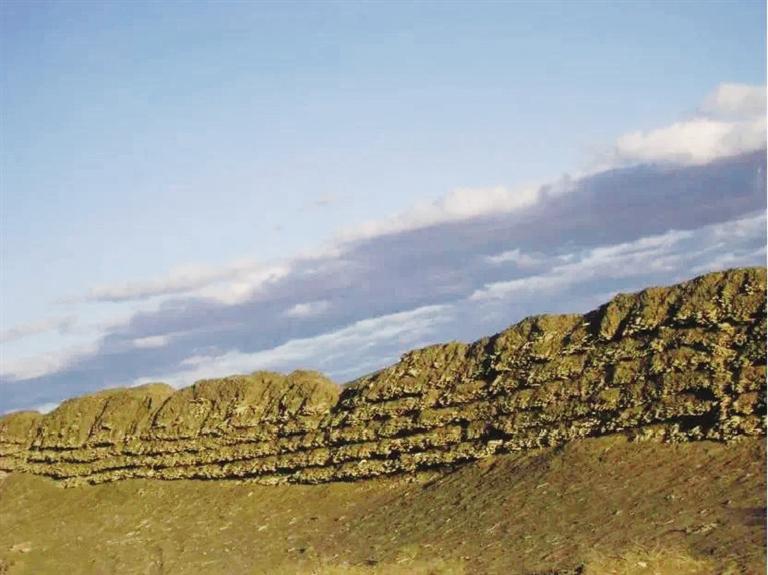 花海漢長城遺址位于玉門市花海鎮(zhèn)西泉村頭墩西側(cè)至二墩東側(cè),西起三墩,東至花海頭墩,全長約3.5公里,長城基寬約2.4米,用沙石、紅柳分層夯筑,最高部分保存有紅柳7層,是河西走廊漢代長城遺址中保存較完好的地段之一。為有效保護漢長城花海段遺址,近年來,玉門市積極實施漢長城防護工程,對該段因長期遭受風力侵蝕,病險較為嚴重的長城本體進行了搶險加固,在花海鎮(zhèn)頭墩西側(cè)至二墩河壩間1.5公里地段內(nèi)敷設了6層全封閉刺鋼絲網(wǎng),并在漢長城內(nèi)外兩側(cè)安裝防護欄、樹立保護標志、埋設界樁界碑,有效遏制了人為破壞,對漢長城的保護發(fā)揮了積極作用。