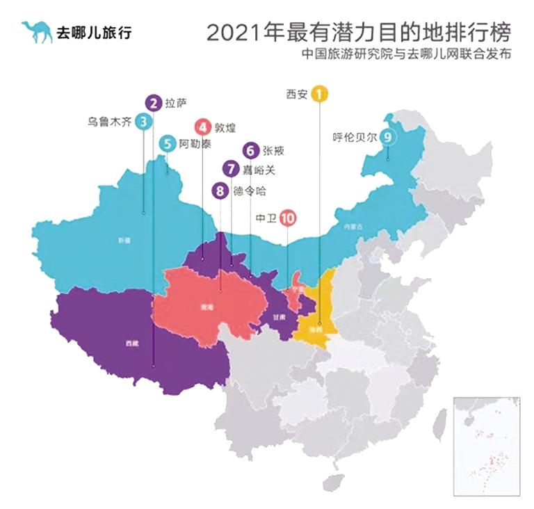 中國旅游研究院與去哪兒網(wǎng)課題組根據(jù)旅游目的地2020年和2019年的預訂增量、平均價格、出行時間和搜索熱度,發(fā)布2021年最有潛力目的地排行榜和2021年小眾旅游目的地排行榜。其中前十位的目的地包含我省敦煌、張掖、嘉峪關(guān)三座絲路名城,今年西北地區(qū)將在2021年吸引更多游客前往。