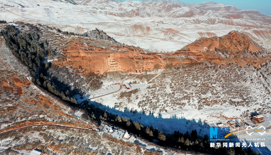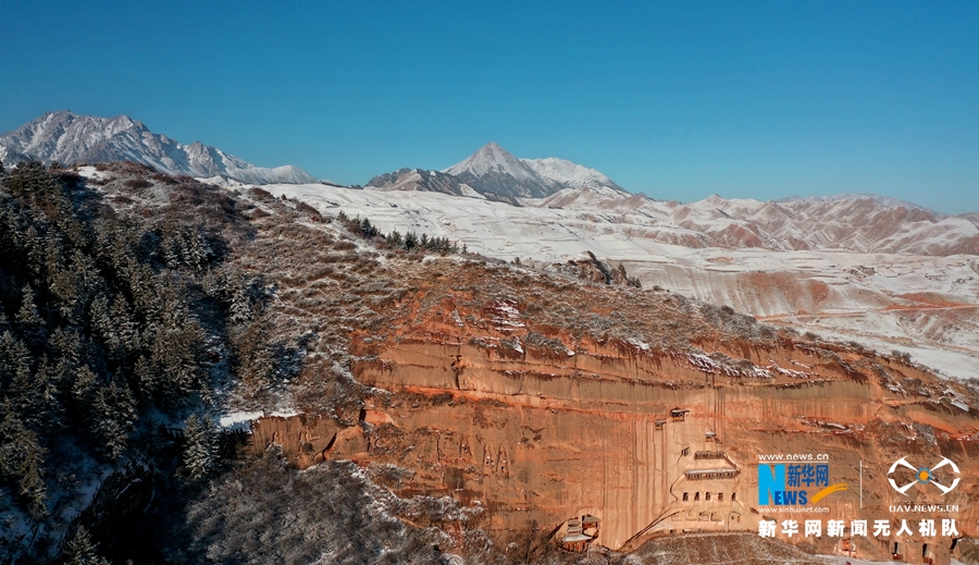 當(dāng)日,雪霽初晴的甘肅省張掖市肅南裕固族自治縣馬蹄寺風(fēng)景區(qū),松海翠柏銀裝素裹,與丹霞峭壁上的石窟相互映襯,如一幅美麗畫(huà)卷。