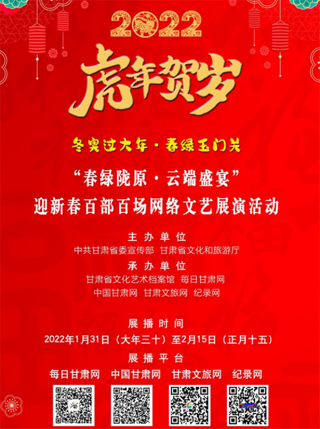 甘肅省博物館在春節(jié)期間舉辦了“虎虎生福——壬寅(虎年)新春生肖文物聯(lián)展”,甘肅省圖書(shū)館舉辦7大專題30余項(xiàng)文化體驗(yàn)活動(dòng)。在“春之華章”2022年甘肅省電視春節(jié)聯(lián)歡晚會(huì)上,原創(chuàng)話劇《八步沙》、隴劇《大禹治水》等精彩上演;甘肅省非遺保護(hù)中心開(kāi)展了“虎虎有神過(guò)大年——如意甘肅·多彩非遺”宣傳推廣活動(dòng);甘肅演藝集團(tuán)通過(guò)線上線下結(jié)合方式,開(kāi)展2022“我們的中國(guó)夢(mèng)”——文化進(jìn)萬(wàn)家迎新春文藝演出活動(dòng);張掖市舉辦春節(jié)“九曲黃河燈陣啟燈納福非遺文化展演”活動(dòng)。