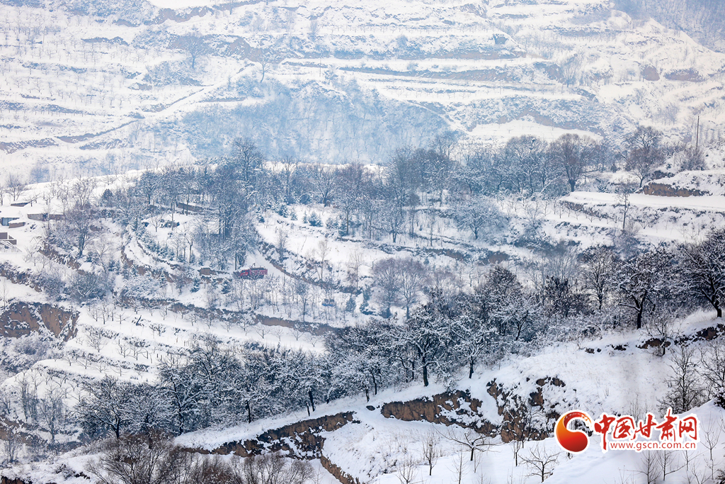 2月8日,雪過天晴,甘肅省平涼市靜寧縣賈河鄉(xiāng)侯山村銀裝素裹,美不勝收。果園、梯田、房屋、公路及遠山構成了一幅天然的鄉(xiāng)村畫卷。