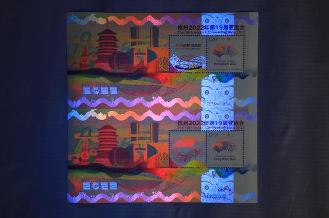 據(jù)了解,《杭州2022年第19屆亞運(yùn)會》特殊版式個(gè)性化郵票雙連張是中國集郵有限公司匠心打造的首款GPZ編號體育題材郵票,由青年設(shè)計(jì)師趙郁竹擔(dān)綱設(shè)計(jì),限量發(fā)行。它依托杭州亞運(yùn)會色彩系統(tǒng)和視覺形象元素,融歷史文化、現(xiàn)代美學(xué)和未來暢想于一體,集藝術(shù)感、科技感和運(yùn)動(dòng)感于一身,展現(xiàn)中華文明、浙江風(fēng)采、杭州韻味和時(shí)代魅力,采用特殊版式、編號和工藝,紫光燈下局部呈現(xiàn)無色熒光油墨圖案和全真彩效果,傳遞中國郵政對杭州亞運(yùn)的美好祝福。(圖片由人民日報(bào)客戶端提供)