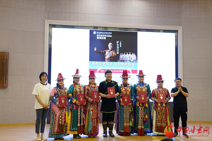 中國甘肅網(wǎng)7月1日訊 近日,甘肅裕固族歌唱組合薩爾組合主唱薩爾帶著他的裕固族伙伴們走進(jìn)西北師范大學(xué)音樂學(xué)院,進(jìn)行“課程思政教學(xué)實踐”——《裕固族民歌中的服飾文化》交流分享活動。同時,西北師范大學(xué)音樂學(xué)院副院長晏曉東為七位裕固族民間音樂傳播者頒發(fā)了音樂學(xué)院聘書。