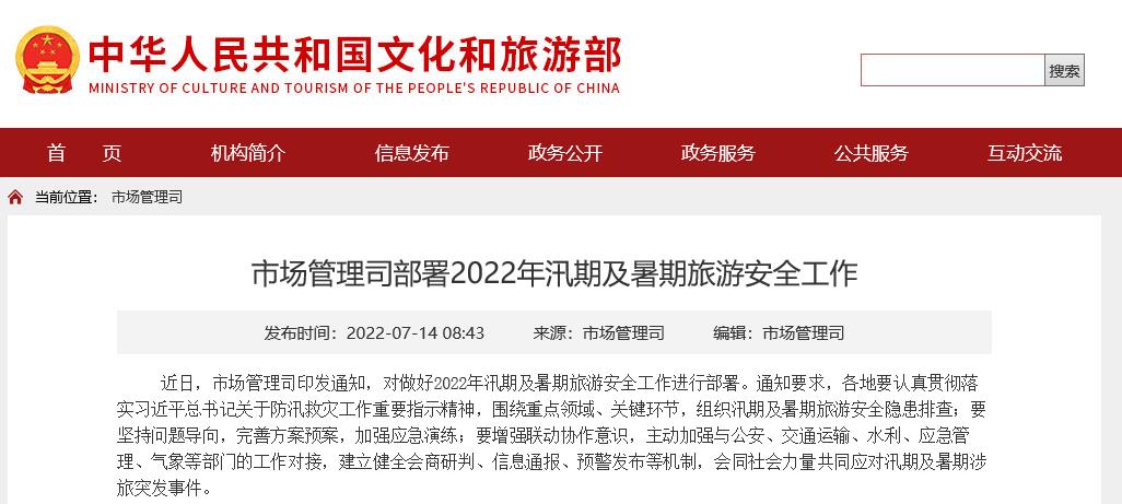 據(jù)文旅部網(wǎng)站消息,近日,文旅部市場管理司印發(fā)通知,對做好2022年汛期及暑期旅游安全工作進(jìn)行部署。