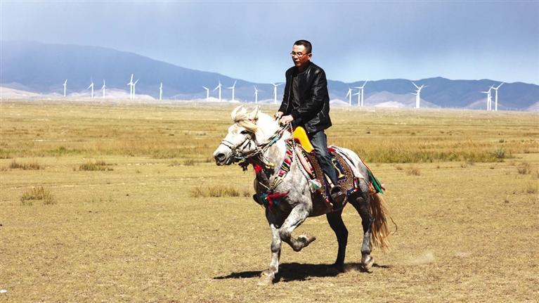 驅(qū)車向草原腹地進(jìn)發(fā),遠(yuǎn)遠(yuǎn)就能看見有人在馴馬。馴馬者房利軍和他的坐騎“尕青”仿佛“人馬合一”,同呼吸、共步調(diào),一遍遍練習(xí),像走,更像飛。這便是傳說中的走馬文化,和跑馬的加速度不同,走馬不管是走還是跑,都是快步勻速,短途速度快,長途耐力強(qiáng),騎乘平穩(wěn),姿態(tài)優(yōu)美,觀賞性強(qiáng)。在牧區(qū),走馬實用性強(qiáng),深受當(dāng)?shù)厝藲g迎。曾有專家稱,“馬踏飛燕”的“馬”即為走馬。每天,和武威天祝一山之隔的這片草原,都與房利軍有關(guān),在這里,他專心馴馬,而他的500只羊則在一旁撒歡。尤其從高空俯瞰,草原牧羊的畫面甚是壯觀。看完馴馬,房利軍騎馬帶路,采訪車沿著馬道回到了“家”。