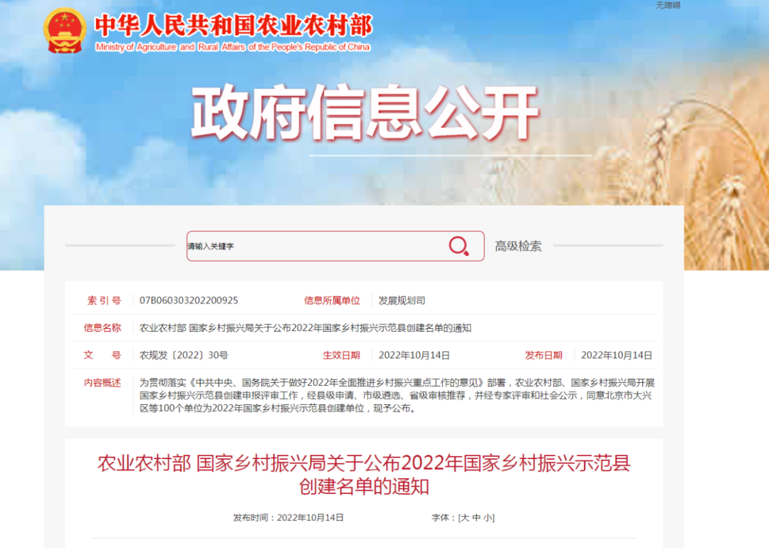 農(nóng)業(yè)農(nóng)村部、國家鄉(xiāng)村振興局開展的國家鄉(xiāng)村振興示范縣創(chuàng)建申報(bào)評(píng)審工作近日完成,北京市大興區(qū)、河南省蘭考縣、四川省眉山市東坡區(qū)等100個(gè)單位為2022年國家鄉(xiāng)村振興示范縣。其中甘肅省會(huì)寧縣、民勤縣、臨澤縣三地上榜。