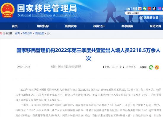 來(lái)自國(guó)家移民管理局的數(shù)據(jù)顯示,2022年第三季度,全國(guó)移民管理機(jī)構(gòu)共查驗(yàn)出入境人員2218.5萬(wàn)余人次;共簽發(fā)普通護(hù)照32萬(wàn)本,較第二季度增加49.5%;簽發(fā)往來(lái)港澳臺(tái)出入境證件簽注117.2萬(wàn)本(枚);為在華外國(guó)人辦理簽證停留居留證件16.5萬(wàn)證次。