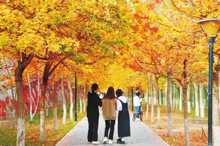 微風(fēng)輕拂,嬌黃的樹葉紛紛飄落,陽光透過葉片滲出幾分清朗,這是專屬秋的浪漫。隨便鋪開畫紙,蘸取一點點秋色,藍(lán)天、紅墻、金葉……都是最美的色調(diào)。古樸靜雅的校園彌漫著秋思,斑駁的陽光灑在圖書館的墻上,在濃濃的書卷氣中把農(nóng)歷十月寫進(jìn)秋的詩行,有思念、有沉淀、有墨香……蘭州“醉”美的大學(xué)校園,每一片落葉都是美的化身,綿延了時光,溫情了步履……