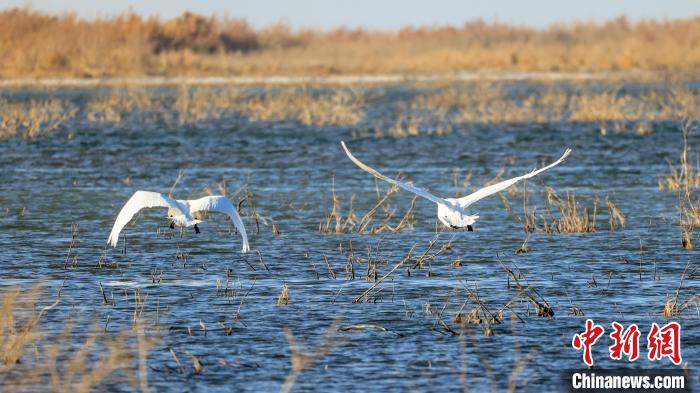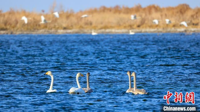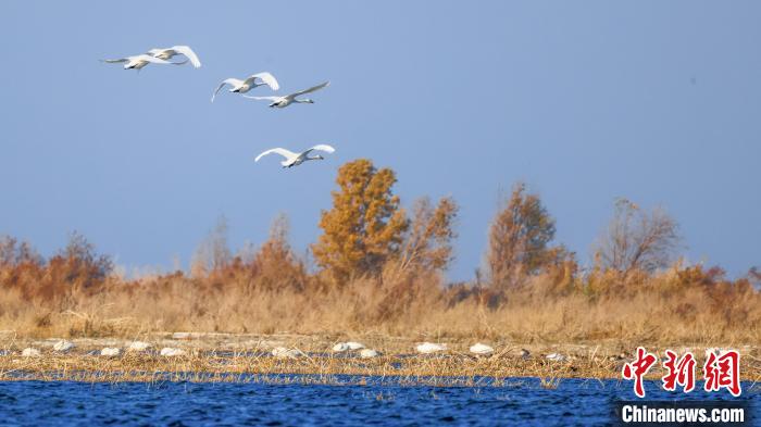 中新網(wǎng)烏魯木齊11月15日電(年磊)11月14日,位于新疆維吾爾自治區(qū)巴音郭楞蒙古自治州博湖縣境內(nèi)的博斯騰湖白鷺洲迎來(lái)大批天鵝,它們?nèi)宄扇航Y(jié)伴游弋,嬉戲追逐,優(yōu)雅的身姿成為博斯騰湖一道靈動(dòng)的風(fēng)景線。