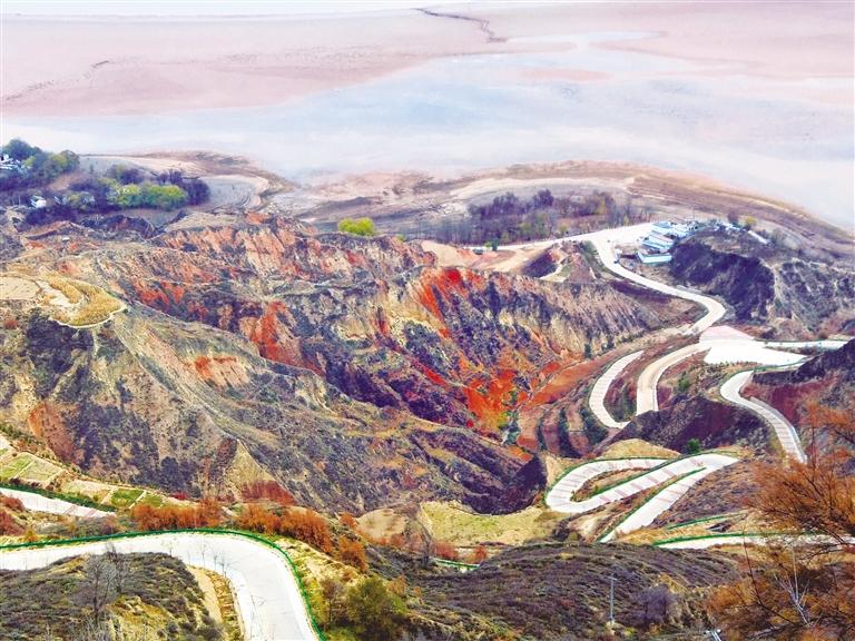 初冬時(shí)節(jié)的劉家峽庫區(qū)沿岸,盤山公路、丹霞地貌與碧水構(gòu)成了一幅多彩畫卷