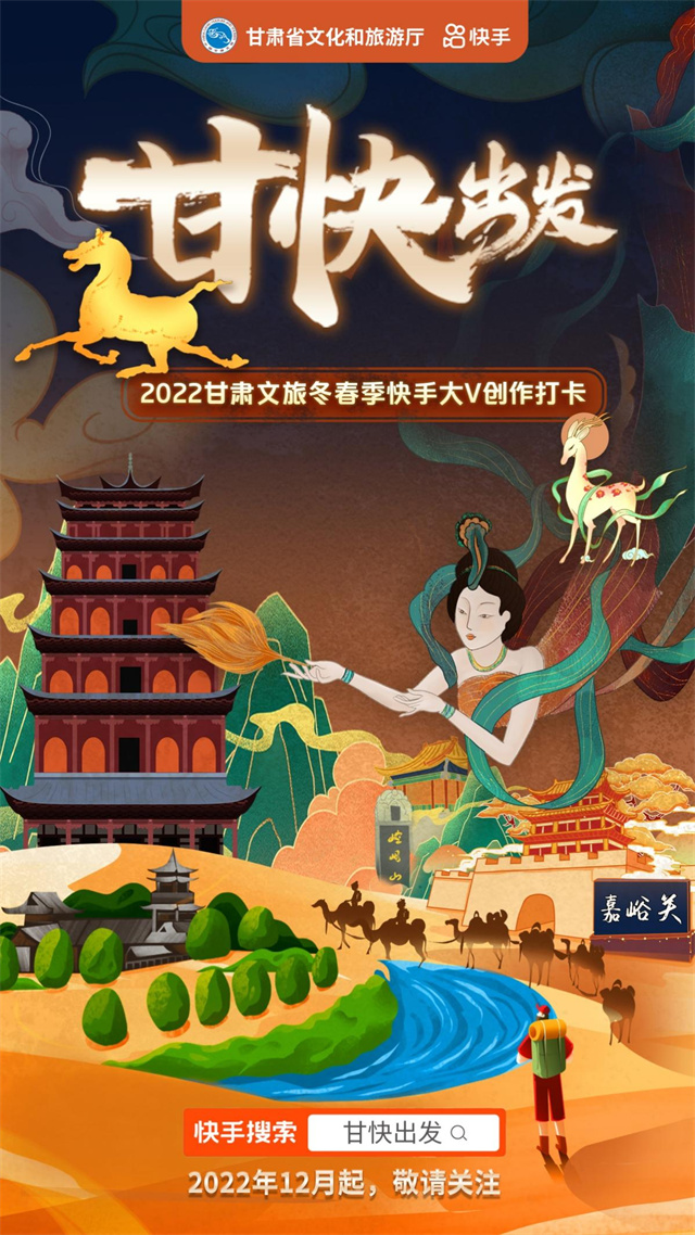 為加快推進(jìn)全省文旅行業(yè)復(fù)工復(fù)產(chǎn),激活冬春旅游市場(chǎng),甘肅省文旅廳聯(lián)合快手科技舉辦的“甘快出發(fā)”2022甘肅文旅冬春季快手大V創(chuàng)作活動(dòng)于12月16日啟動(dòng)。本次活動(dòng)整合快手文旅達(dá)人創(chuàng)作力量,10名來自全國(guó)的快手粉絲平均超過100萬的大V組建成“甘快出發(fā)”2022甘肅文旅冬春季快手大V創(chuàng)作采風(fēng)團(tuán),于12月16日—31日分組分批次落地甘肅10城,以“狂想甘肅十大必體驗(yàn)?zāi)康牡?rdquo;為品牌創(chuàng)作方向,進(jìn)行甘肅文旅深度采風(fēng)和短視頻內(nèi)容制作,為網(wǎng)民呈現(xiàn)多元、細(xì)致、獨(dú)特的甘肅角度,打造獨(dú)有的“視頻甘肅”名片。