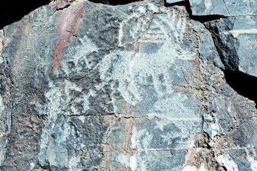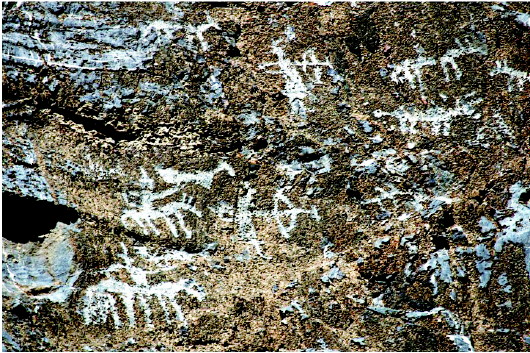 肅北縣大黑溝巖畫是全國(guó)重點(diǎn)文物保護(hù)單位,巖畫形成時(shí)間初步斷定在春秋、戰(zhàn)國(guó)至西漢時(shí)期,位于肅北縣城東約40公里處的大黑溝。巖畫共有34組,圖案190多幅,零亂分布在3.5公里長(zhǎng)的山溝中,畫面內(nèi)容多為射獵、放牧、練武、乘馬作戰(zhàn)等場(chǎng)景和北山羊、野牛、野駱駝等動(dòng)物,畫面表現(xiàn)形式多以凹刻和凸刻,巖畫大多刻在避風(fēng)向陽的陡峭花崗巖和石灰石上。