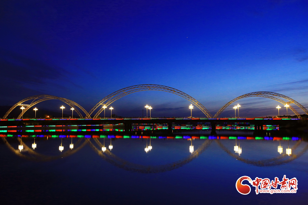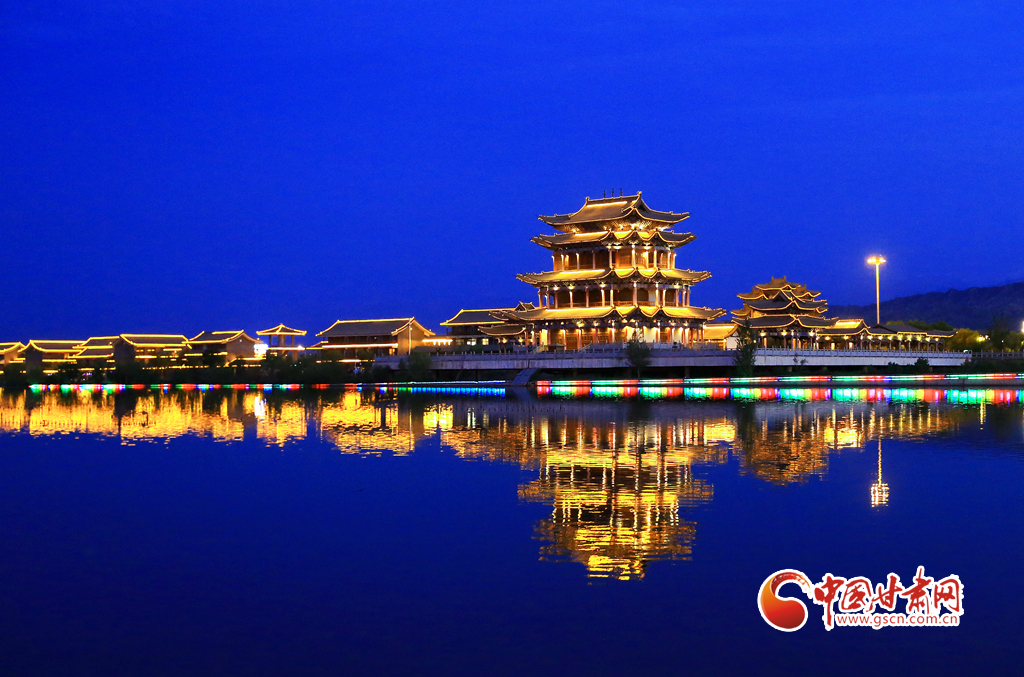 7月5日,甘肅省嘉峪關(guān)市南湖討賴河畔晚霞如輝,夜景璀璨,構(gòu)成一幅美麗的夏日畫卷。
