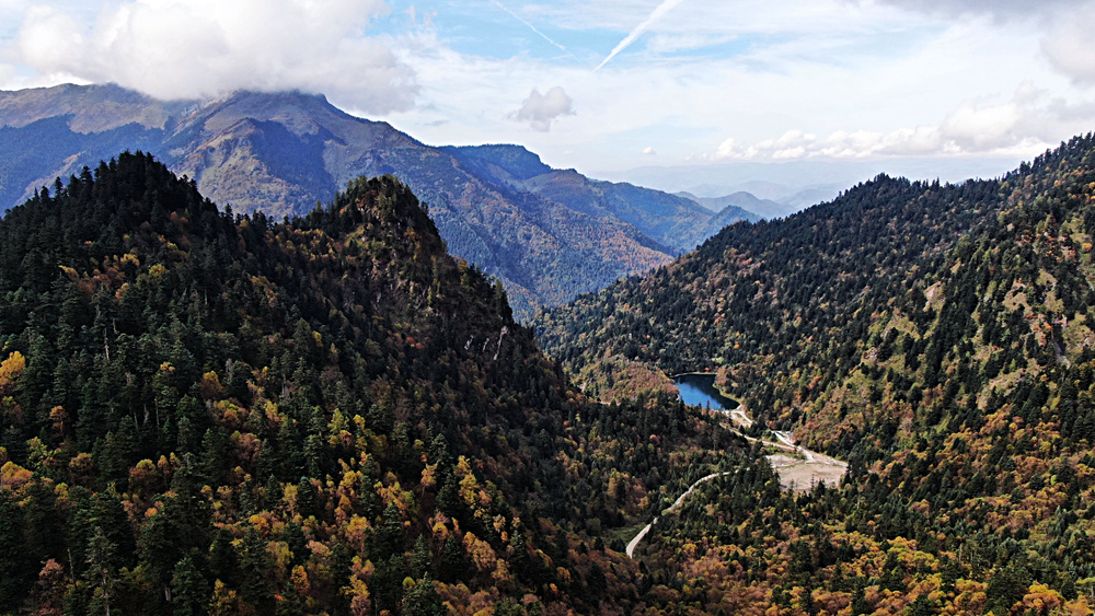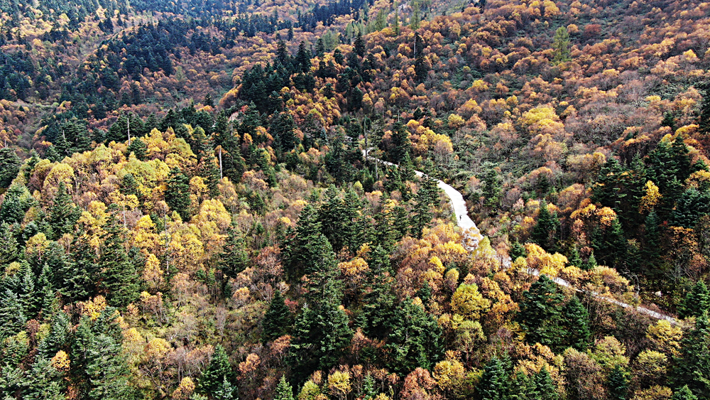 金秋時(shí)節(jié),甘肅省隴南市宕昌縣官鵝溝森林公園層林盡染,斑斕如畫(huà),吸引了不少游客前來(lái)游玩。新華網(wǎng)發(fā)(劉輝 攝)