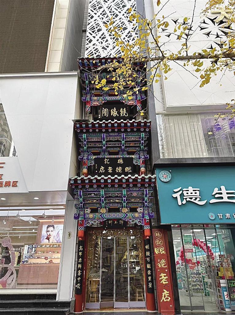 榫卯鑲嵌、手工木雕、精致彩繪、金箔貼邊,在張掖路步行街上,楊記眼鏡行的門樓招牌格外亮眼,雖然只有三四米寬的窄小門面,但店外從上而下的三塊古韻招牌彰顯出這家店的“不簡單”。“最下面這塊‘澤玉軒’的招牌是我家祖輩楊澤玉開創(chuàng)這家眼鏡行時(shí)留下的字號”,楊記眼鏡行是蘭州一家老字號的石頭眼鏡售賣和維修小店,光是制作修理石頭眼鏡這項(xiàng)手藝就已經(jīng)傳到了第五代,其店鋪在二十世紀(jì)八九十年代就獲得過商務(wù)部的“中華老字號”認(rèn)可。