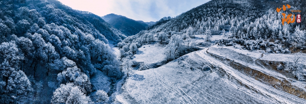 關山被白雪覆蓋,滿山樹木掛滿了晶瑩的雪花,好像穿上了潔白的婚紗,格外美麗。
