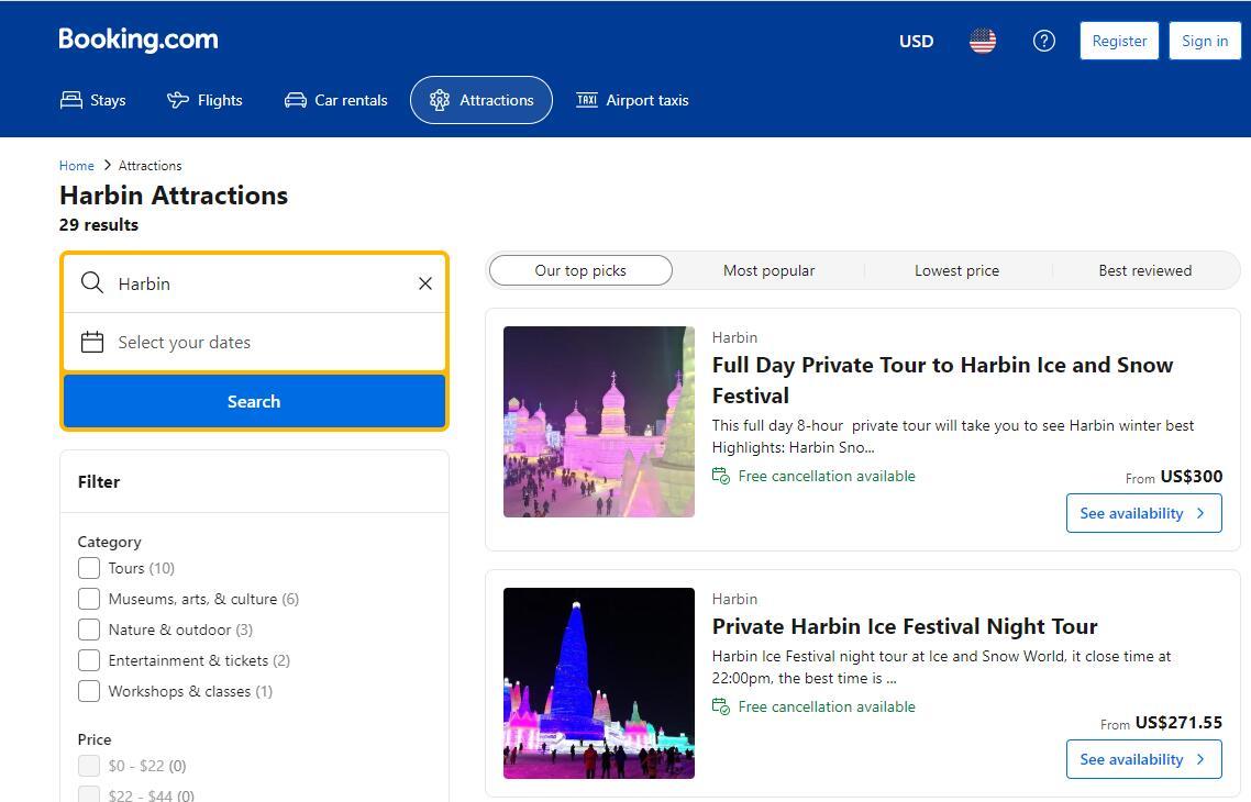 在酒店及住宿在線預訂平臺Booking.com上,可以搜索到近30個關于哈爾濱旅游的服務。其中,“哈爾濱冰雪節(jié)全日私人旅游”包括私人汽車和導游費用,不包括門票收費300美元,包括門票則收費480美元。“哈爾濱冰雪節(jié)私人夜游”包括私人汽車、私人旅游、酒店接送、門票,收費271.55美元起。