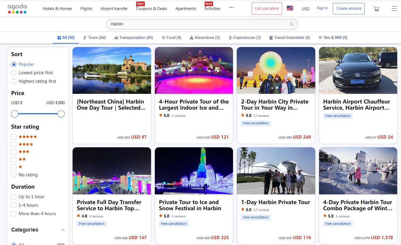 在線預訂平臺Agoda上也可以搜索到數(shù)十個關于哈爾濱旅游的服務。大約8小時的“哈爾濱一日游”,包括私人導游服務和用車費用,收費97美元起。為期2天的“哈爾濱市私人旅游”,包括私人導游服務、交通費(私人汽車或公交車/出租車)、酒店接送,收費249美元起。(中新網(wǎng)財經(jīng) 記者 吳家駒)