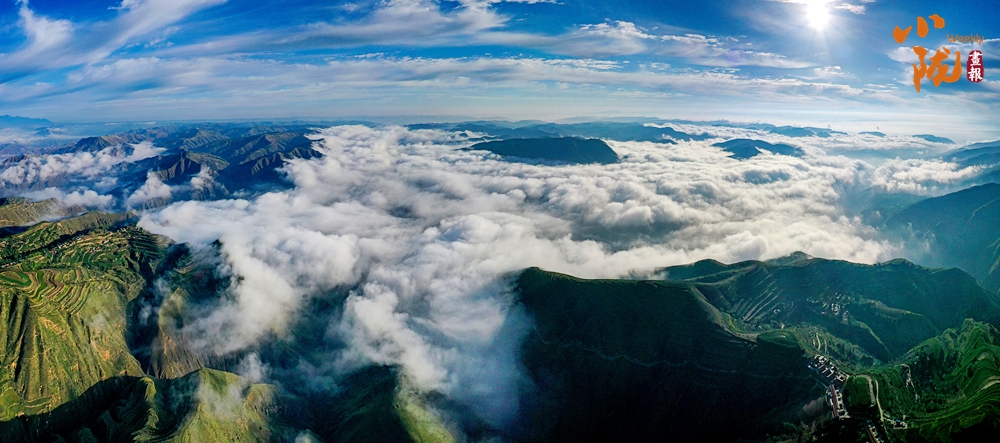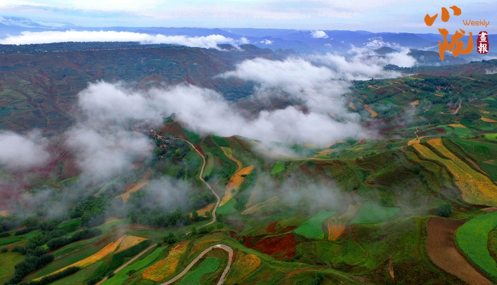 在旅游大通道積石山段遠(yuǎn)眺,云霧穿山飄過(guò),遠(yuǎn)處的村莊和梯田時(shí)隱時(shí)現(xiàn),遠(yuǎn)山近嶺,草樹煙村......置身其中,仿佛步入了人間仙境。
