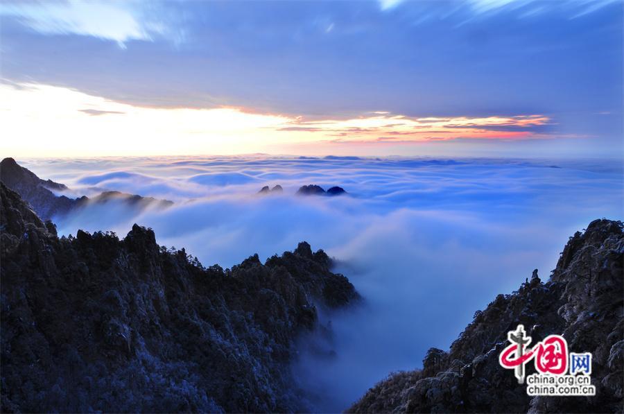 原標(biāo)題:只有一個黃山:雪后云海日出朝霞描繪絢麗畫卷