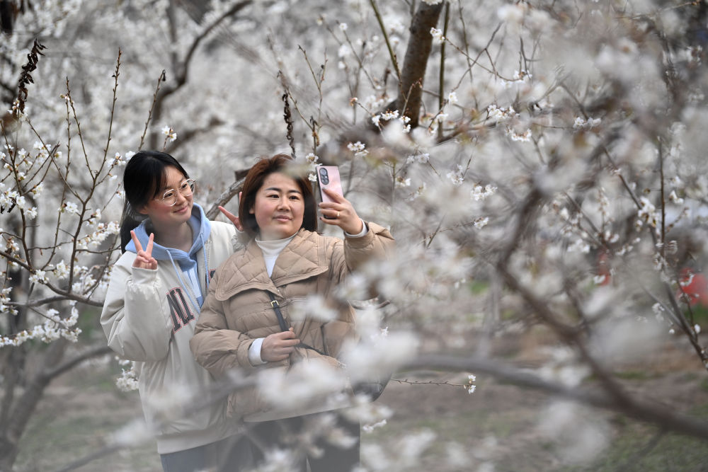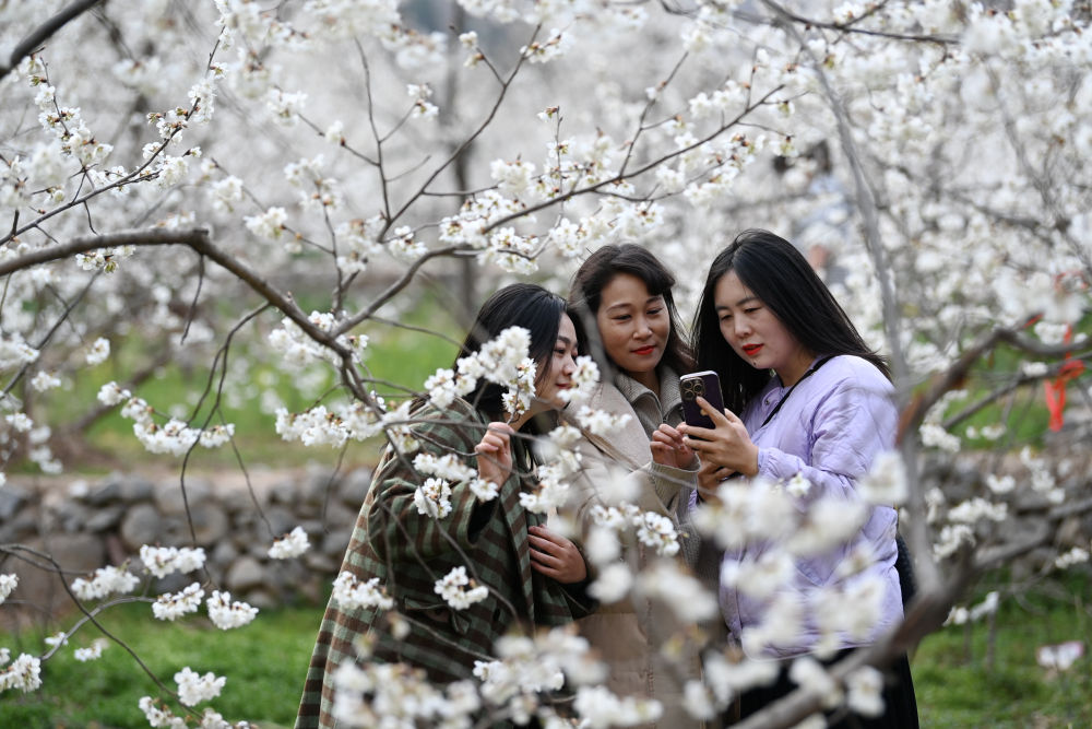 3月9日,兩名游客在隴南市武都區(qū)城關(guān)鎮(zhèn)石家莊村的櫻桃樹下拍照留念。新華社記者 陳斌 攝