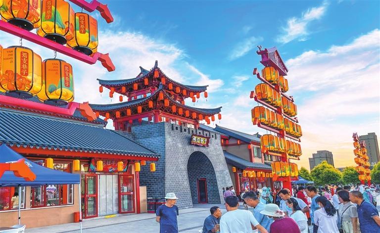 夏日的傍晚,這里格外熱鬧。步入巷內,穿過仿古牌坊,行走在青石板路上,經過新中式仿古的巷子,寬敞的街道兩邊都是仿古的建筑,曲徑通幽處,美食坊,手工作坊,酒吧街,一字兒鋪排開,小攤上當?shù)刈灾频纳介狻⑥r民自己種的各種蔬菜、自制的各種小工具、精美小籮筐、葫蘆瓢等好多物品勾起了兒時的回憶。