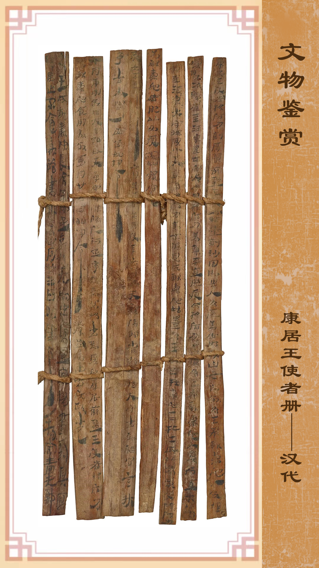這份珍貴冊書記錄內(nèi)容為:永光五年(公元前39年),康居王使者和蘇薤王使者及貴人所獻的貢物在酒泉評估時發(fā)生了糾紛,朝廷責(zé)令敦煌郡和效谷縣進行調(diào)查并將當(dāng)時的情況如實上報。該冊書的出土,不僅為研究當(dāng)時的行政和司法審判程序提供了第一手資料,更重要的是為研究漢朝與康居國的關(guān)系提供了原始資料,亦是今天的中亞各國研究本國古代歷史的重要資料,可補傳世史籍之闕載?,F(xiàn)藏甘肅簡牘博物館。