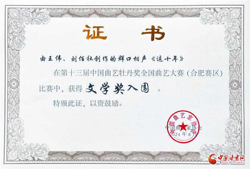 據(jù)了解,中國曲藝牡丹獎,是全國性曲藝藝術(shù)專業(yè)最高獎項。第十三屆中國曲藝牡丹獎全國曲藝大賽(合肥賽區(qū)),由中國文學(xué)藝術(shù)界聯(lián)合會、中國曲藝家協(xié)會、安徽省文化和旅游廳、安徽省文學(xué)藝術(shù)界聯(lián)合會、合肥市人民政府主辦,于8月18日至23日舉辦,是本屆牡丹獎四個分賽區(qū)中的最后一站,主要面向相聲、小品、“三書”類節(jié)目。中國曲協(xié)18家團(tuán)體會員、中國曲協(xié)香港會員分會、中國曲協(xié)有關(guān)專業(yè)委員會、中直文藝院團(tuán)以及省級文藝院團(tuán)報送的節(jié)目參賽。期間,共收到480多個節(jié)目,48個節(jié)目入圍,《這十年》為甘肅地區(qū)唯一一件入圍作品。