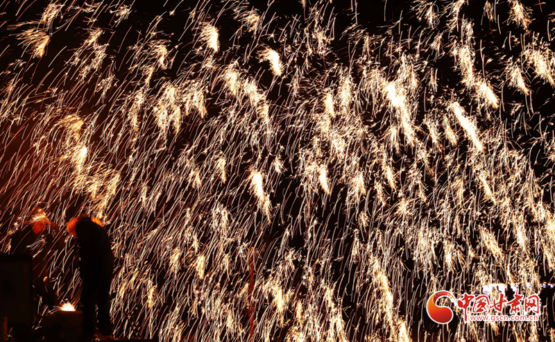 10月5日晚,位于甘肅省張掖市甘州區(qū)的玉水苑生態(tài)景區(qū)內,非遺傳承人在為游客和市民表演國家級非遺項目打鐵花。(王將 攝)