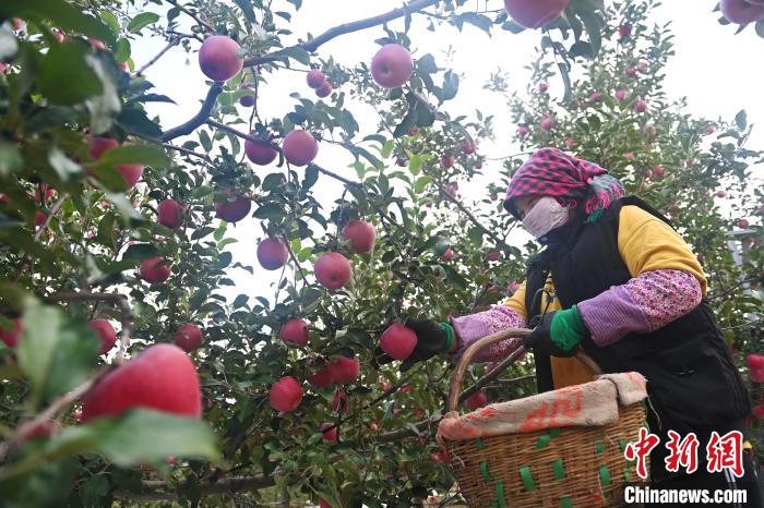 10月21日,在甘肅省天水市秦安縣一果園內(nèi),果農(nóng)進行蘋果采收工作。李亞龍 攝