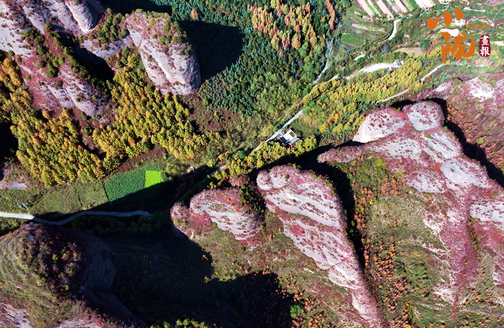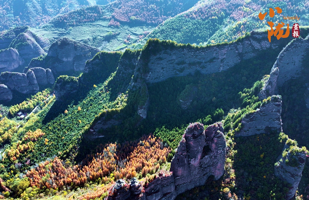 站在山頂,俯瞰四野,山勢(shì)挺拔,直插云霄,山巒被紅、黃、橙、綠各種顏色渲染,盡顯山巒疊翠之美。