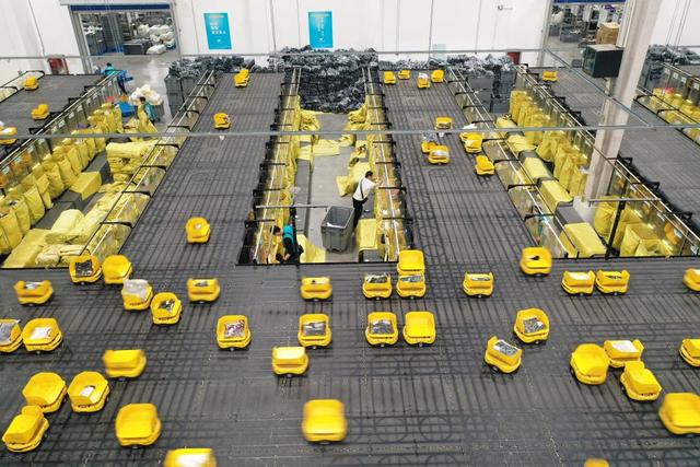 11月7日,浙江省湖州市德清縣乾元鎮(zhèn)第一產業(yè)智慧物流園區(qū)快魚服飾有限公司華東物流中心,800余臺分揀“小黃人”機器人在精準配送各類服飾(無人機照片)。新華社發(fā)(倪立芳攝)