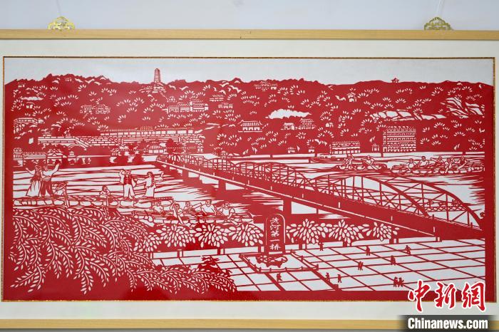 圖為展出以蘭州標志性建筑中山橋為主題的剪紙作品。中新社記者 九美旦增 攝