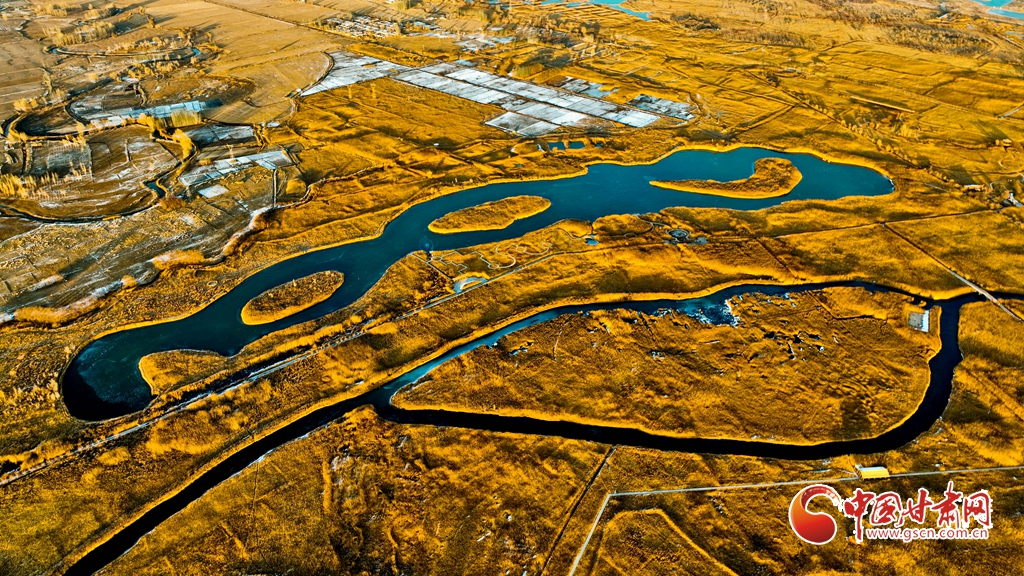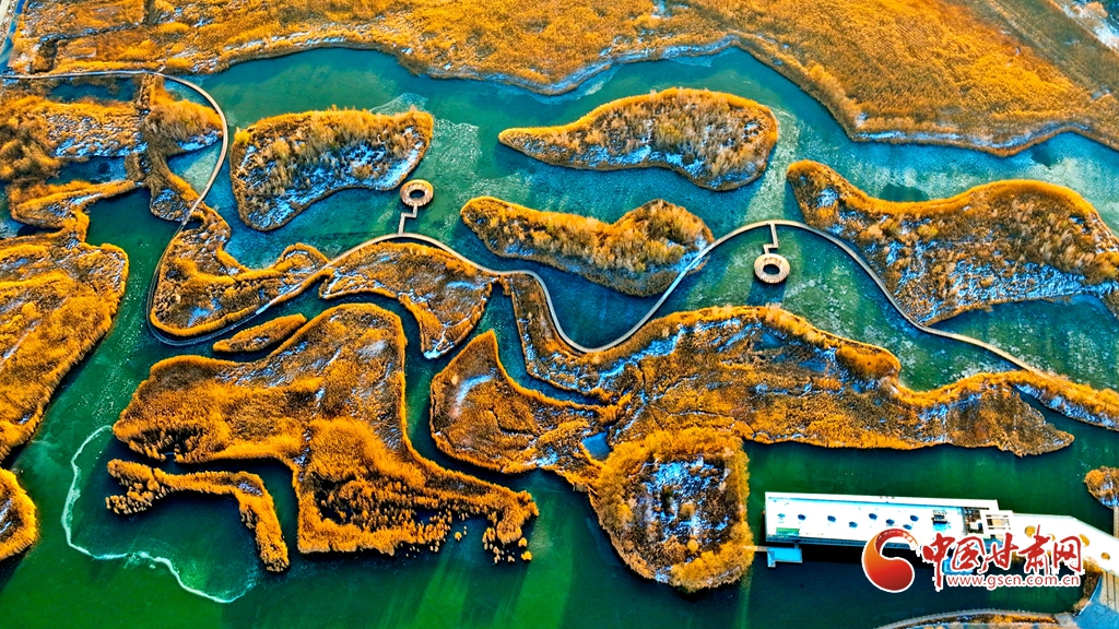 12月1日,俯瞰甘肅張掖國(guó)家濕地公園,夕陽(yáng)余暉映照,金色茂密的蘆葦隨風(fēng)搖曳,蘆花翩翩起舞,碧波蕩漾的水面逐漸凝結(jié)成冰,整個(gè)濕地化作一片金色的童話仙境,令人陶醉于無(wú)盡的遐想之中。