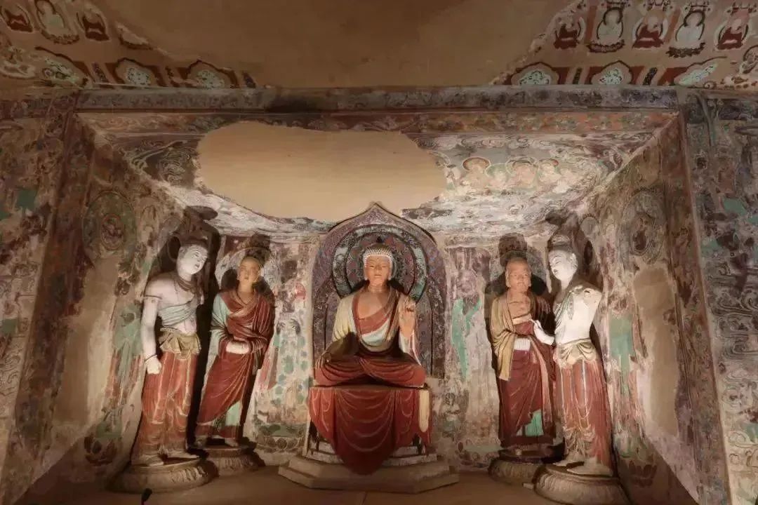 經(jīng)歷了8年的復(fù)原方案討論、實(shí)驗(yàn)及準(zhǔn)備,2000年,從南湖店搬來兩個(gè)洞窟,被安置在莫高窟北區(qū)大沖溝新建的兩個(gè)洞窟內(nèi)。關(guān)于洞窟壁畫的復(fù)原,我們采取了掛壁畫的方法,這是一種獨(dú)創(chuàng)的方法。壁畫是掛在埋入墻體的角鋼架上的。首先做好定位,掛起的壁畫暫時(shí)固定,等待全窟壁畫拼裝結(jié)束,檢查準(zhǔn)確無誤后,將掛起的壁畫牢固地固定在角鋼架上,并將壁畫背面的鋸縫隙用麻泥填充。我們算是開創(chuàng)了壁畫搬遷修復(fù)的新方法。20多年多去了,如今兩個(gè)搬遷洞窟的壁畫及塑像保持狀態(tài)良好。對(duì)塑像的保護(hù),就是對(duì)其中一個(gè)洞窟內(nèi)僅存的兩身佛、一身菩薩進(jìn)行搬遷和復(fù)原。把佛像和菩薩像與崖體分離,牢固地包裝好塑像,然后運(yùn)送至莫高窟。最后,將塑像按照原有位置及關(guān)系進(jìn)行了復(fù)原。