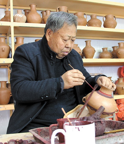 64歲的閻建林(見圖,本報記者趙帥杰攝)是甘肅省級非物質(zhì)文化遺產(chǎn)項目陶器制作技藝代表性傳承人。走進(jìn)他位于定西市臨洮縣洮陽鎮(zhèn)河口村的家中,院落里、窗臺上,擺滿了大大小小的陶器,足有上百種。“主要是馬家窯彩陶工藝品,敞口的是盆,帶頸的為罐,耳部安有提手的,還可以稱作壺。”閻建林介紹。