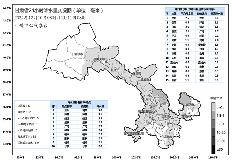中國甘肅網(wǎng)12月11日訊(西北角·中國甘肅網(wǎng)記者 沈文剛)12月10日8時至12月11日8時,全省共計62個縣區(qū)出現(xiàn)小雪,其中蘭州主城區(qū)出現(xiàn)大雪,慶陽北部、白銀中部和北部、臨夏西南部出現(xiàn)中雪。較大降水量出現(xiàn)在蘭州本站5.0mm、靖遠3.5mm、環(huán)縣3.5mm、景泰2.9mm、廣河2.7mm。
