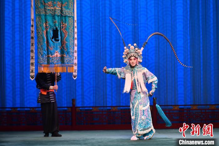 30日晚,“閩臺共譜梨園曲·不負韶華正青春”兩岸傳統(tǒng)文化交流系列活動在福州鳳凰劇院舉辦。圖為臺灣青年演員楊瑞宇在京劇《扈家莊》里飾演扈三娘。中新網(wǎng)記者 呂明 攝