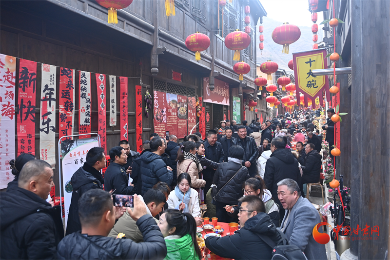白馬民俗長街宴,美食沿著古巷分布,桌椅板凳綿延幾百米,家家戶戶帶來特色美食,一起與游客分享,帶來團圓的問候和特有的民俗體驗,臘肉、臘排都是農家食材,十大碗更是當?shù)孛朗程厣?/p>