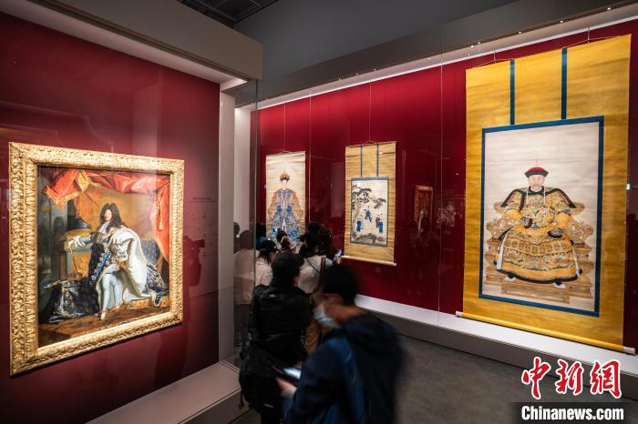圖為故宮博物院藏《雍正帝朝服像》《康熙帝戎裝像》《孝莊文皇后朝服像》(右一起)和法國《路易十四肖像》(左一)同廳展示。中新網(wǎng)記者 侯宇 攝